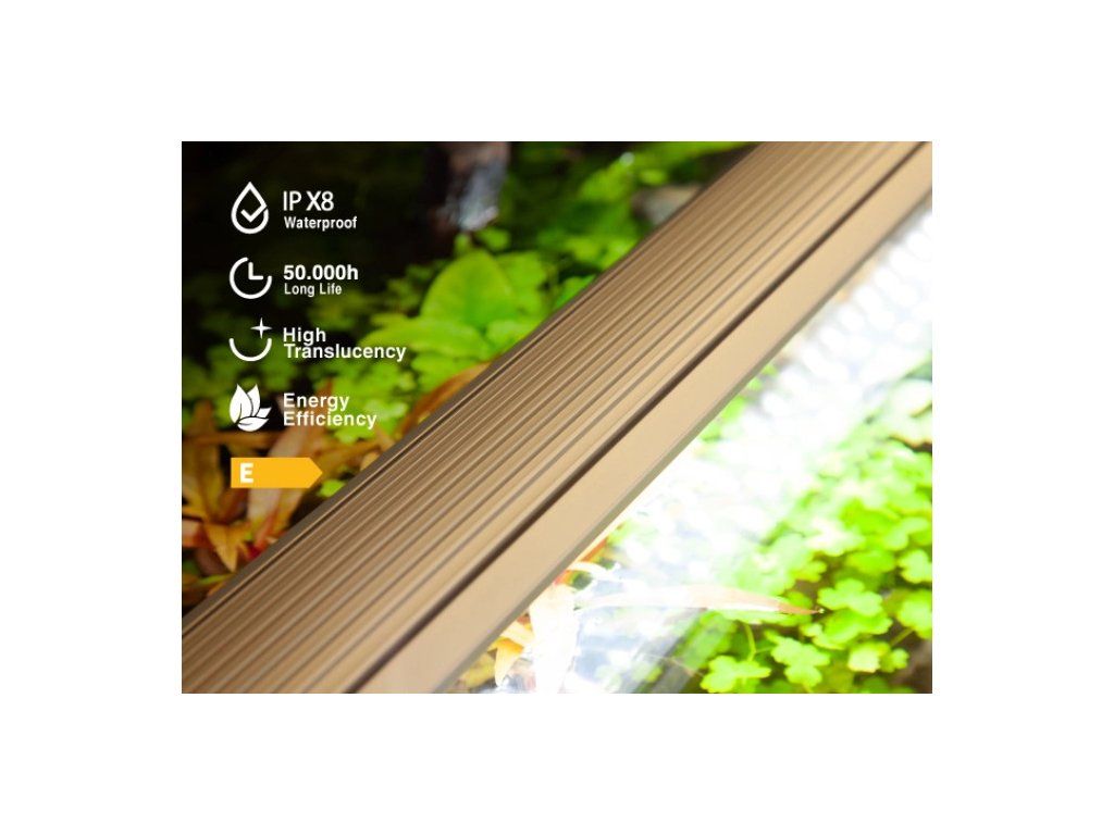 VÝSUVNÉ DRŽÁKY Tato LED osvětlení jsou na obou koncích vybavena výsuvnými kovovými držáky, což umožňuje všestranné umístění na hranu akvária téměř jakékoliv délky. Tento design zajišťuje bezpečné uchycení a přizpůsobí se různým velikostem a tvarům akvárií.