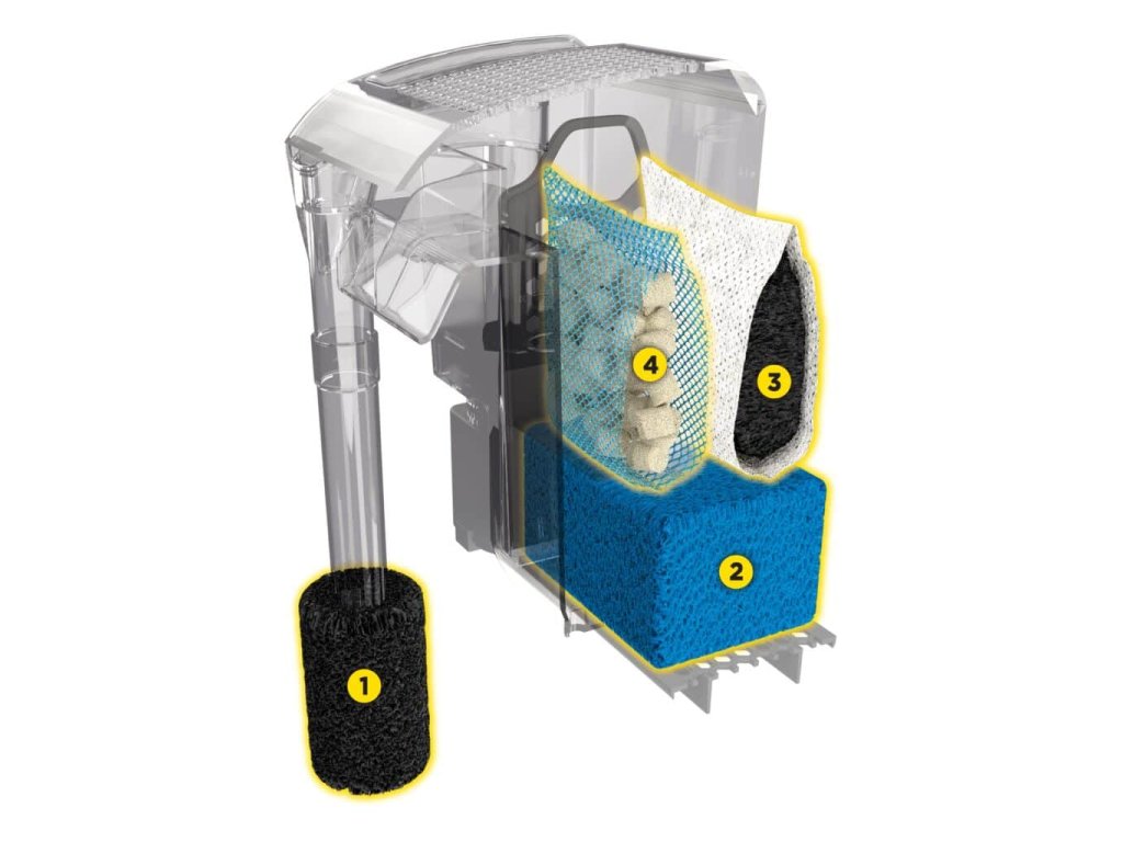 Patentovaný zadní filtr: Prodlužuje dobu kontaktu filtračního média, což vede k čistšímu, zdravějšímu a biologicky stabilnějšímu akváriu.