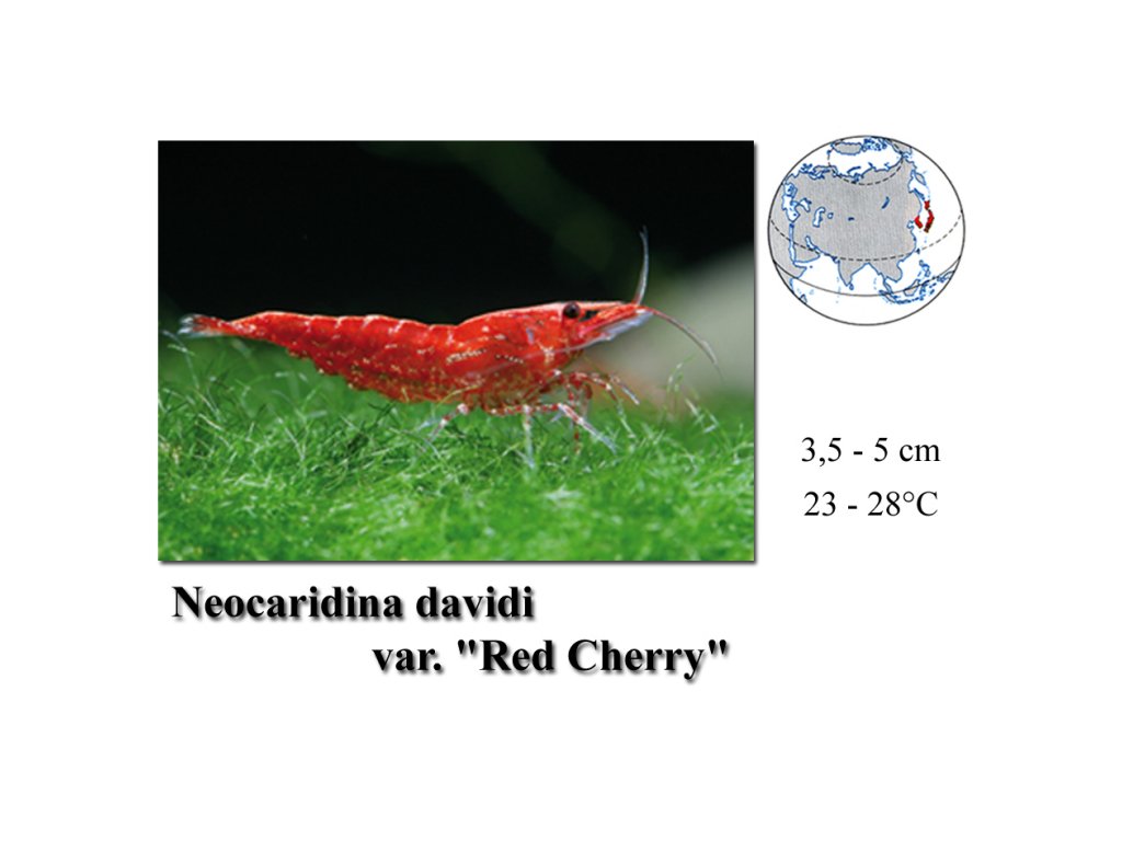 - Nenáročná, červeně zbarvená sladkovodní krevetka, vhodná pro začátečníky, velikost 2 - 4 cm.
