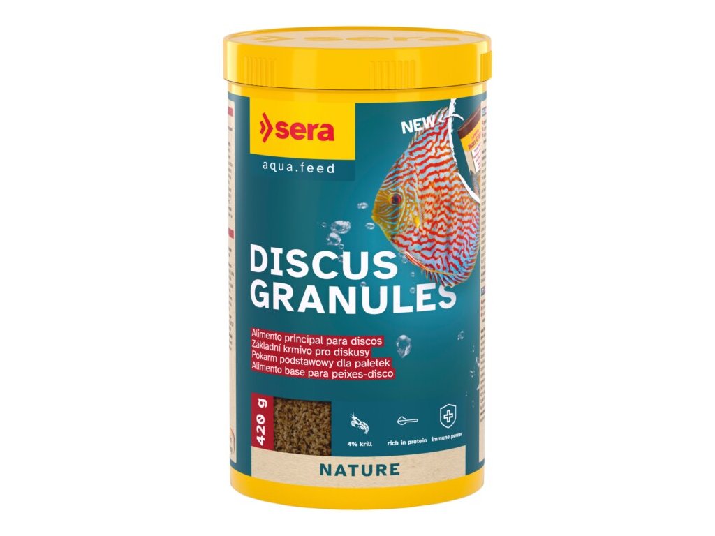 SERA Discus Granules je základní krmivo pro všechny druhy terčovců (včetně plůdku) a další náročné okrasné akvarijní ryby bez umělých barviv a konzervačních látek, ve formě měkkých granulí. Odolnost vůči nemocem, zdravý vývoj i plodnost posilují optimálně stravitelné bílkoviny a složky bohaté na minerální látky. Česnek a prebiotika ideálně doplňují lehce stravitelné, chutné složení. Potápivé granule rychle měknou, aniž by za vlhka nabobtnaly, neztrácejí svůj tvar a nekalí vodu.