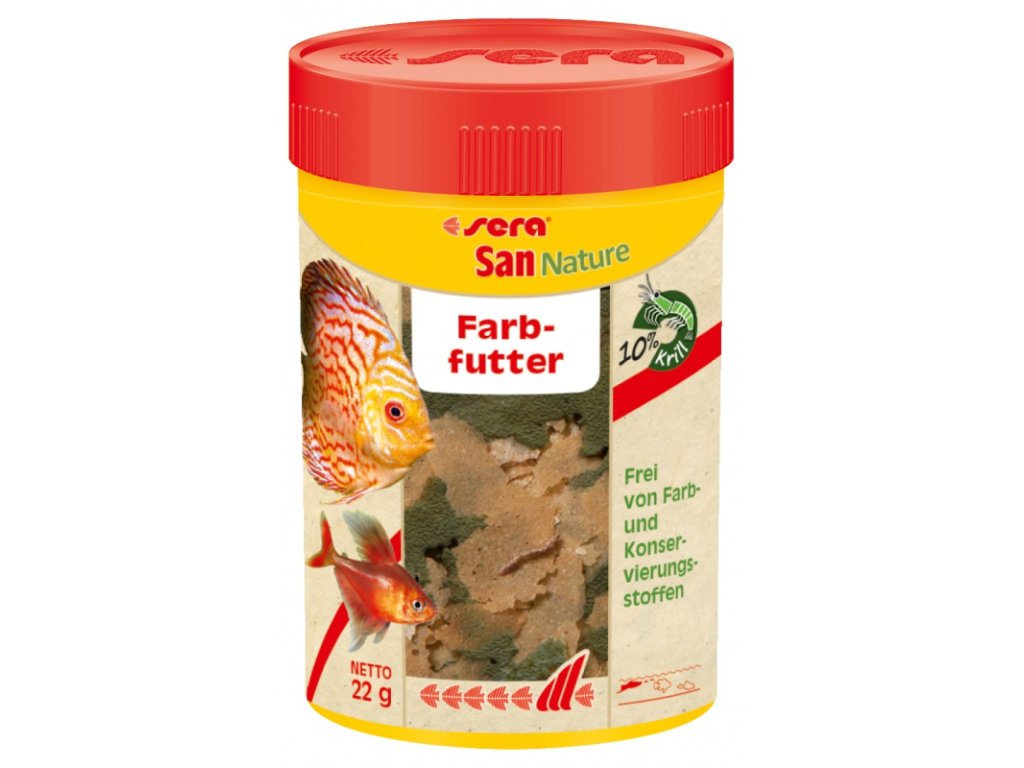 SERA San Color Flakes Nature (dříve SERA San Nature) je prémiové vybarvovací krmivo navržené speciálně pro všechny okrasné ryby, které se živí na vodní hladině. Díky svému čistě přírodnímu složení a vysokému obsahu krillu a řas Haematococcus zaručuje intenzivní a zářivé barvy vašich akvarijních ryb.