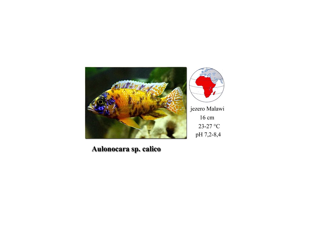- Krásný, klidnější druh větších cichlid s tmavými fleky na bílo-oranžovém těle, z jezera Malawi.